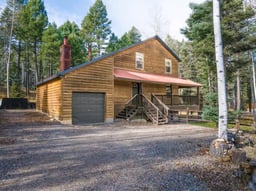 Charming Mountain Retreat with Privacy and Character. Nestled among mature pines and aspens, this beautiful mountain home offers the perfect blend of privacy, comfort, and mountain charm. The main living area features a stunning tongue-and-groove vaulted ceiling and large windows that fill the space with natural light. A striking stone fireplace anchors the open-concept living, dining, and kitchen areas, creating a cozy gathering space for family and friends. There is also a primary suite with ensuite bath on this main-level. Upstairs, the secondary suite boasts its own private balcony and ensuite bath. Also upstairs, a spacious loft offers extra sleeping and recreation space with twin beds, a game table, and a guest bath, while a third bedroom with vaulted ceilings completes the upper floor. A welcoming three-sided wraparound porch, invites you to relax and take in the scenery. The fenced yard is ideal for keeping pets and children safe while complementing the natural surroundings. Additional features include an attached single-car garage and an easily accessible driveway for convenient year-round access. Sold fully furnished and ready to move in! Experience mountain living at its best in this inviting and well-designed home.